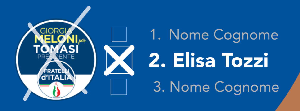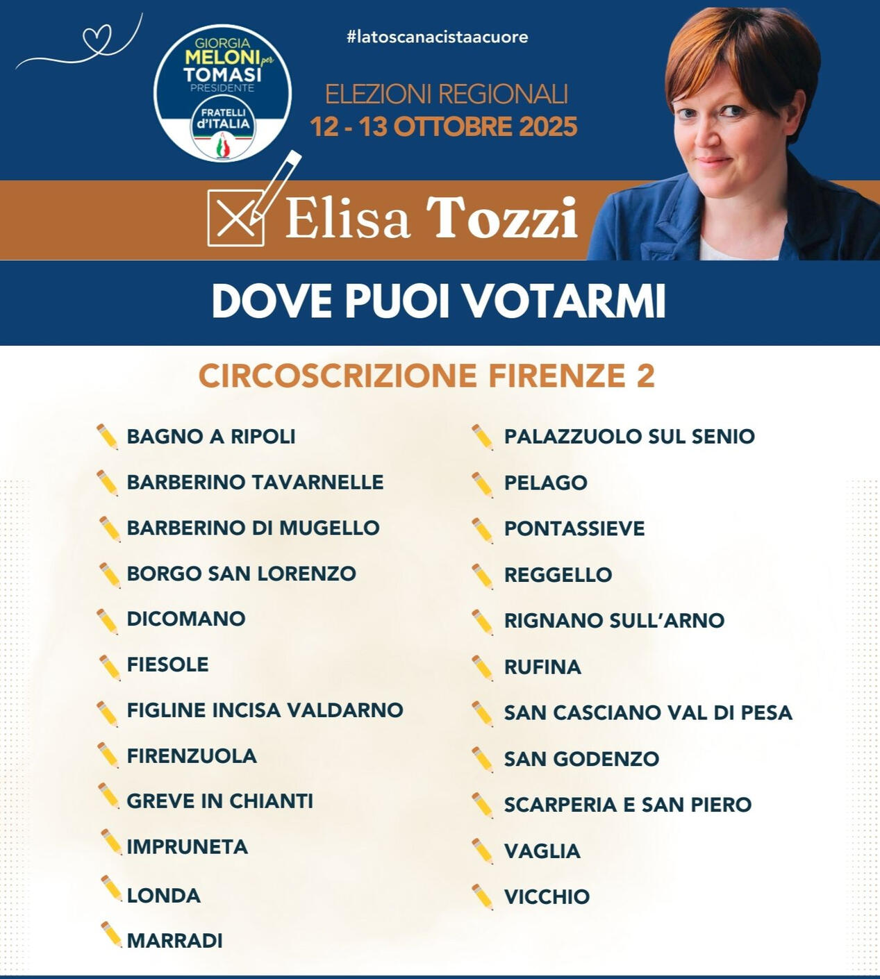 Sono Elisa Tozzi, consigliere regionale dal 2020, candidata per Fratelli d’Italia alle elezioni del 12 e 13 ottobre 2025In questi anni ho lavorato per dare voce ai cittadini, portando in Consiglio temi concreti: tutela del territorio, sanità più vicina alle famiglie, sostegno alle imprese locali.Credo in una Toscana che sappia ascoltare e agire con cuore e concretezza.Cinque anni di lavoro mi hanno insegnato che cambiare è possibile. I prossimi cinque ci serviranno per farlo davvero.Perché la Toscana ci sta a cuore.